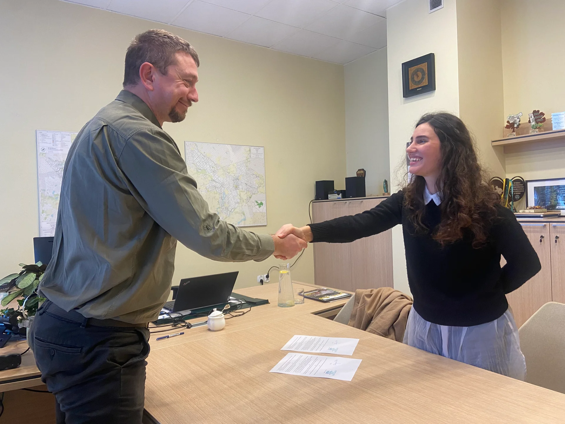 That day, as usual, I arrived at the forest district office early in the morning. I already knew that things are done very early here. Foresters are early birds. Over time, I, too, began to appreciate waking at dawn, quietly putting on a coat, the sight of mist descending after the night, and the forest animals peering from the road-side. I now know almost every corner here. On the threshold, I am usually greeted by an information board, the magazine Forest Echoes, and a seasonal decoration (different depending on the time of year). Sliding doors lead to a sombre, narrow corridor. Maps or thematic boards hang on the walls: tree pests, breeding birds, endangered frog species—these are just some of the educational treasures one can read on the walls. I usually read them while waiting for a meeting.