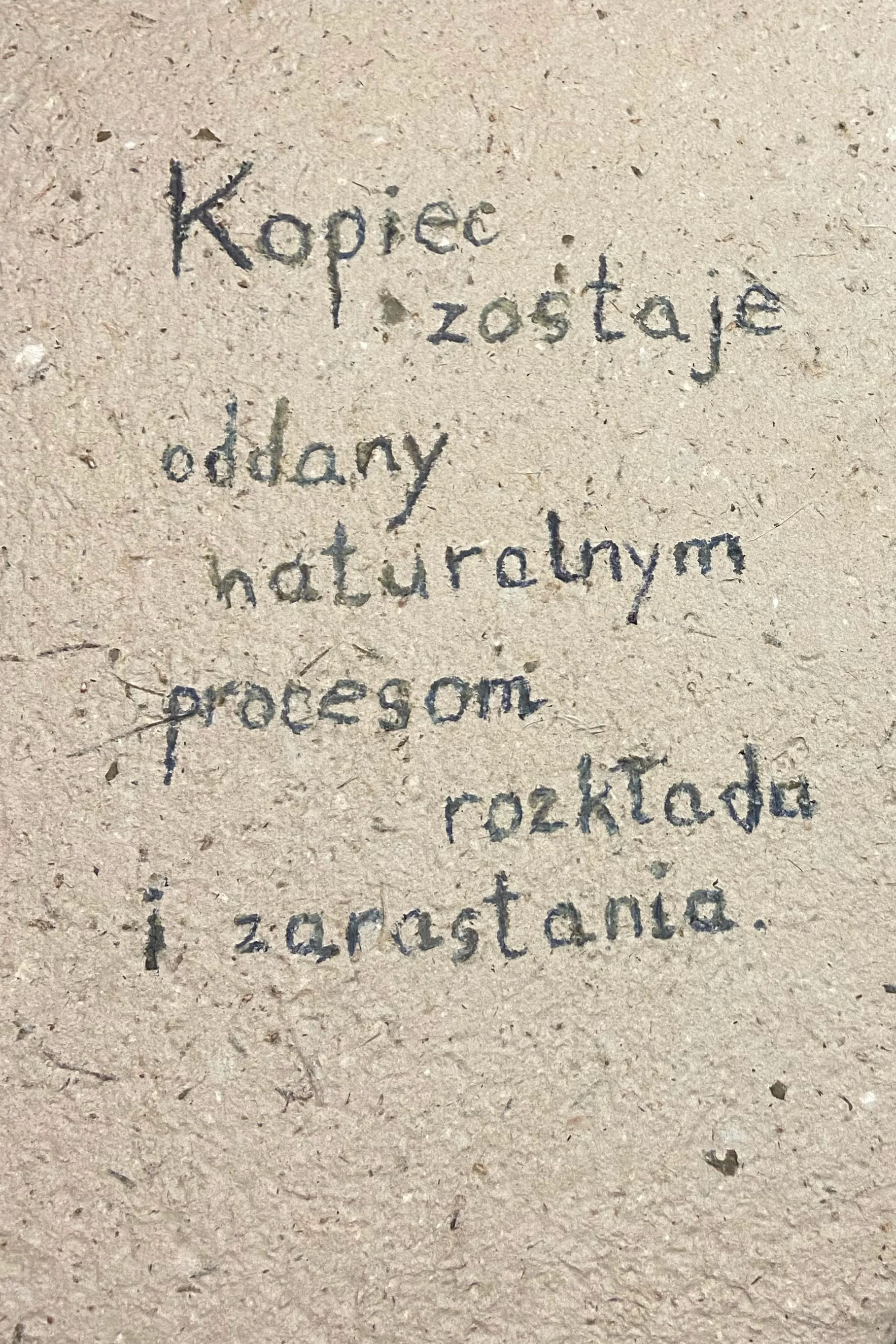 Before the end of the meeting, I take out another document, handwritten on pa-per made from plant and paper waste collected at the Lack of Forest. It contains heather and bird cherry, fibrous Rowley’s elder, some crumbled Challenger, larch needles, a handful of dried reindeer moss, St. John’s wort, raspberry leaves, and some green peat. Using a feather from a white-tailed eagle found near the mound, dipped in pigment extracted from common privet growing near my home, I wrote: “The Mound is surrendered to processes of decay and overgrowth.” This principle is important: care for a living monument should not consist of shaping it, but tending it; the mound will be shaped by natural processes. In doing so, I integrate decay, decomposition, and chaos into the ordered world of the managed forest. This is an agreement heralding the arrival of a different paradigm, a “different” forest. I show the document to the forest manager, who looks at me, perplexed. I suggestively push it toward him. “Should I sign this, yes?”. “Yes, if you agree with this statement.” The forest manager looks at the sheet for a long moment. What else could he read here? What meanings in this sentence trouble him? By signing, would he abuse his authority? Would he make a fool of himself? I can only imagine the doubts arising in the uniformed man’s mind. “Here?” he finally asks, reaching for a pen. “Yes, on the right; I’ll sign on the left. And the stamp, too.”